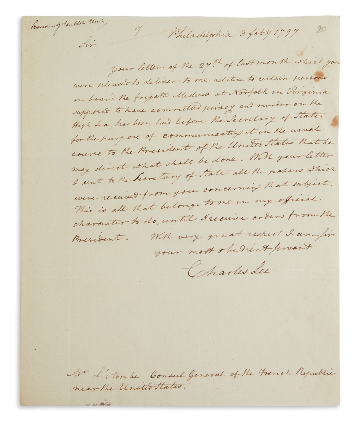 Autograph Letter Signed, as U.S. Attorney General, to Consul General of France, Philippe Joseph Létombe, reporting that he has done his duty by forwarding Létombe’s papers concerning the alleged acts of piracy at Norfolk. 3/4 page, 4to, with integral blank Philadelphia, 3 February 1797
